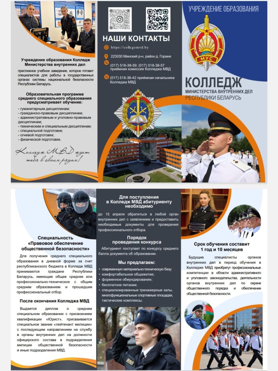 Поступление в колледж МВД Республики Беларусь требует наличия общего среднего или профессионально-технического образования, прохождения профотбора и конкурса среднего балла аттестата. Обучение очное (1 год 10 мес.), за счет бюджета, с предоставлением обмундирования и питания.